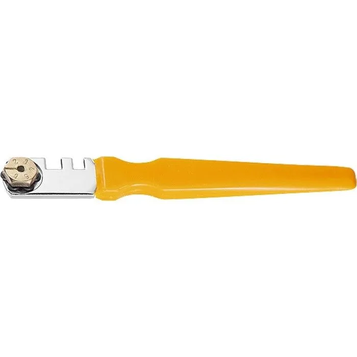 Шестироликовый стеклорез Sparta 872205 с пластмассовой рукояткой служит для резки стекла толщиной до 6 мм и подходит для бытового использования. С его помощью можно изготовить столешницу, полочку, заменить стекло в аквариуме или двери. Блок с 6 роликами позволяет быстро установить новый режущий элемент взамен изношенного — достаточно ослабить винт и повернуть головку. На головке имеются пазы шириной 4 и 5 мм для отламывания кромки стекла, увеличивающие функциональность стеклореза.