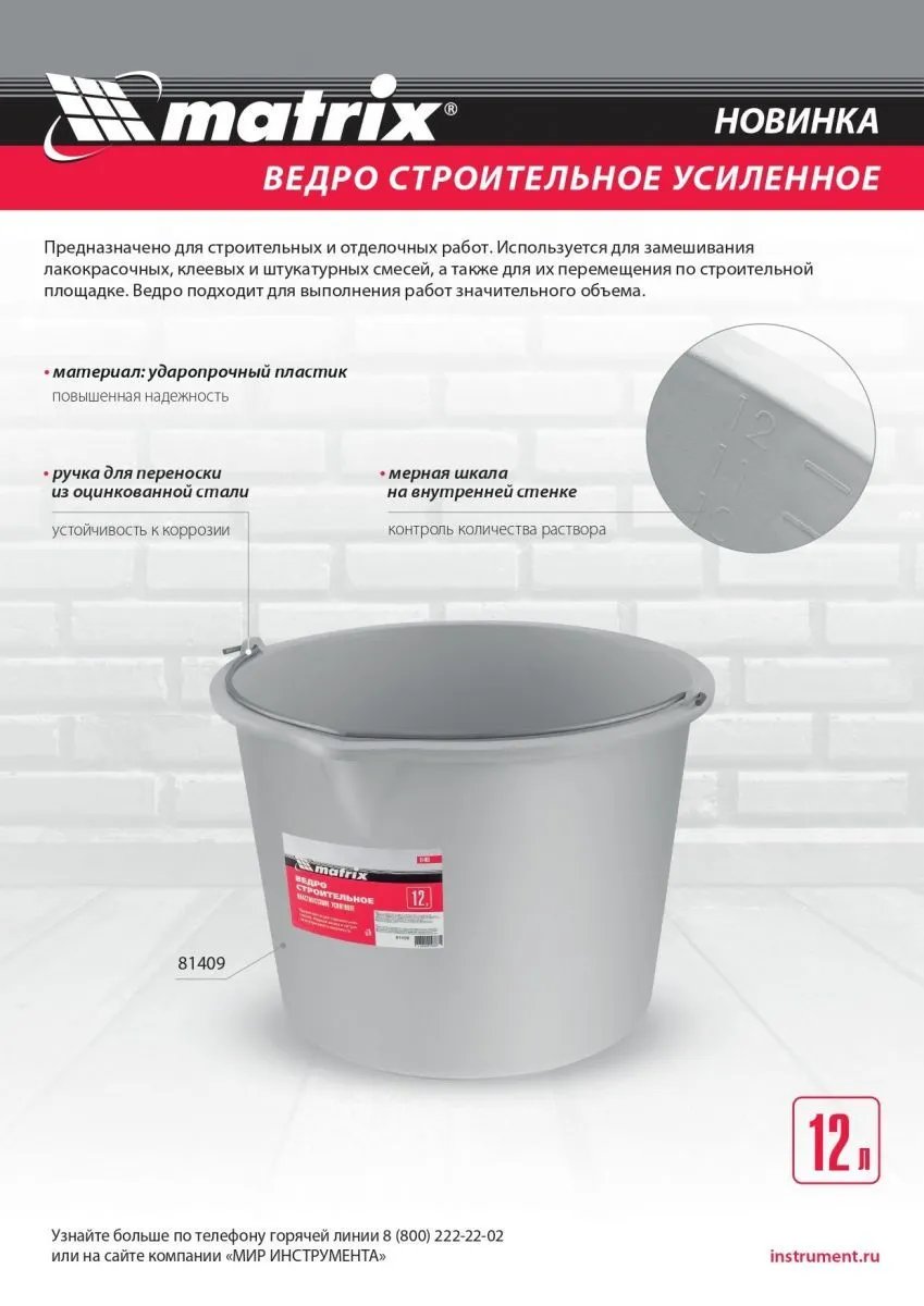 Ведро строительное пластмассовое Matrix 81409 объемом 12 л, усиленное, используется для строительных и отделочных работ. В нем можно замешивать лакокрасочные, клеевые и штукатурные смеси, а также перемещать их по строительной площадке. Ведро вмещает до 12 л раствора и подходит для выполнения работ значительного объема.