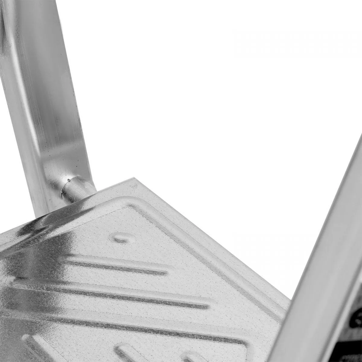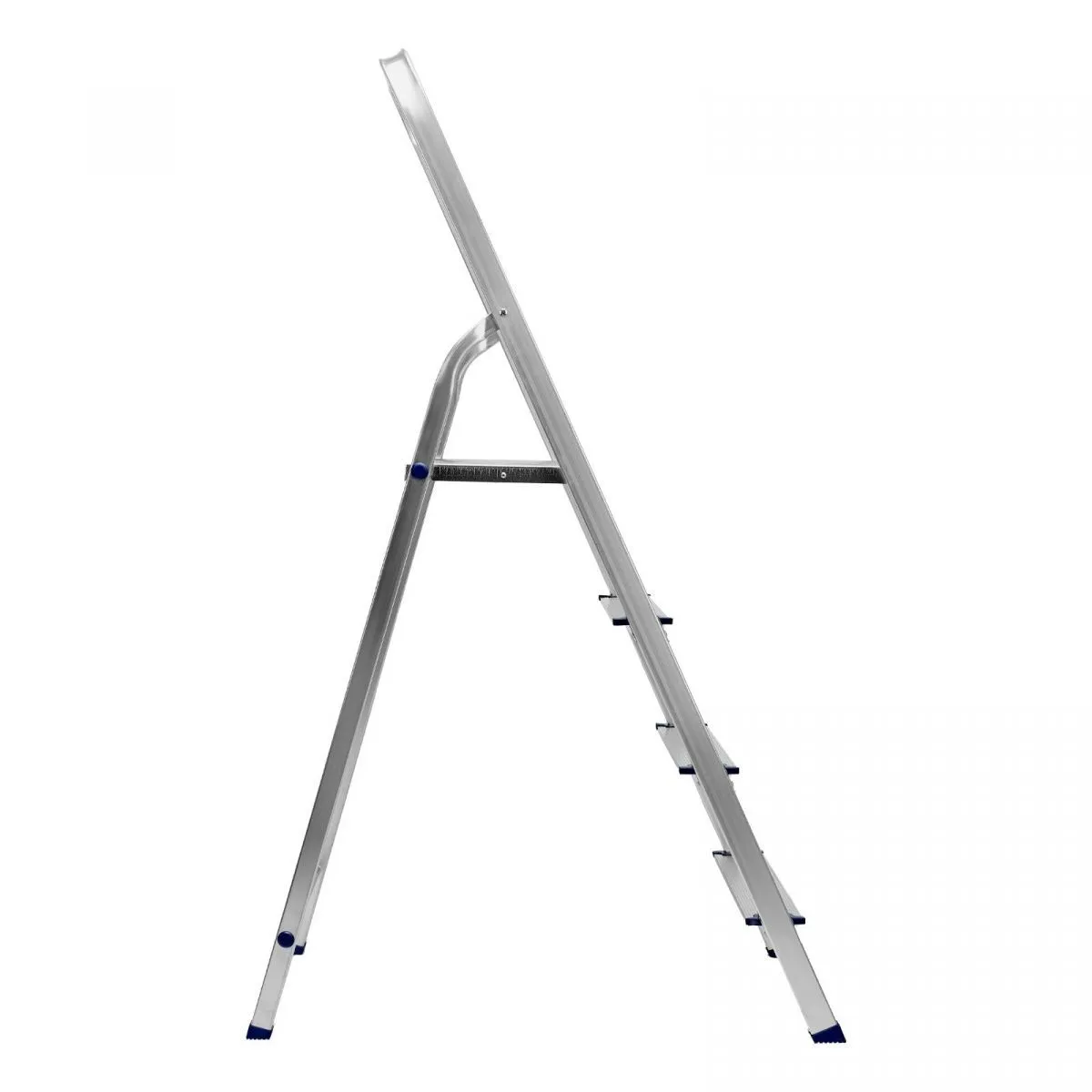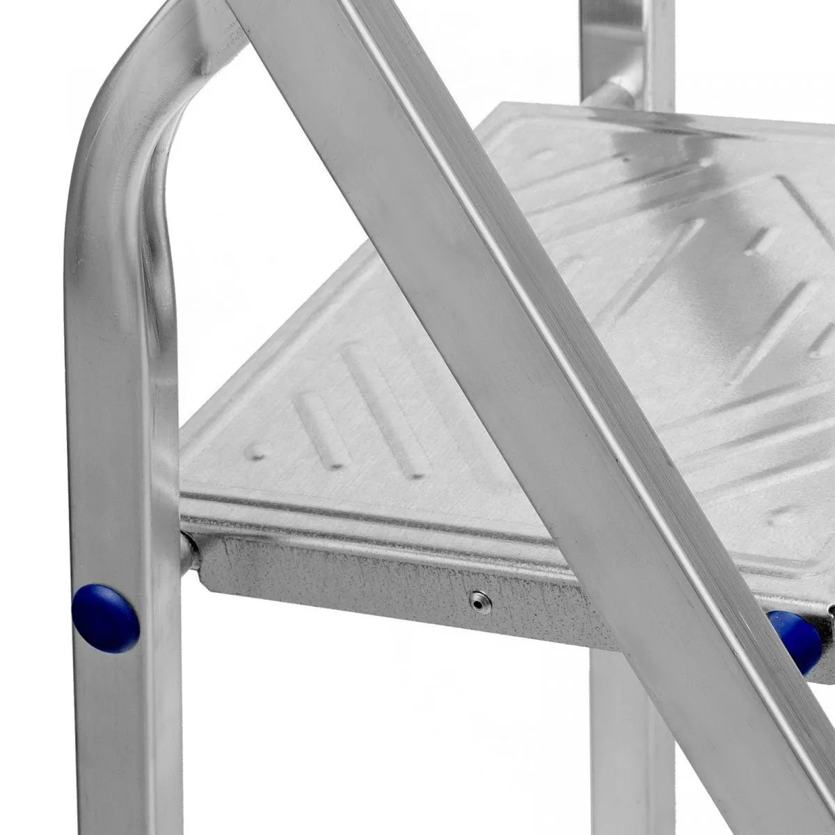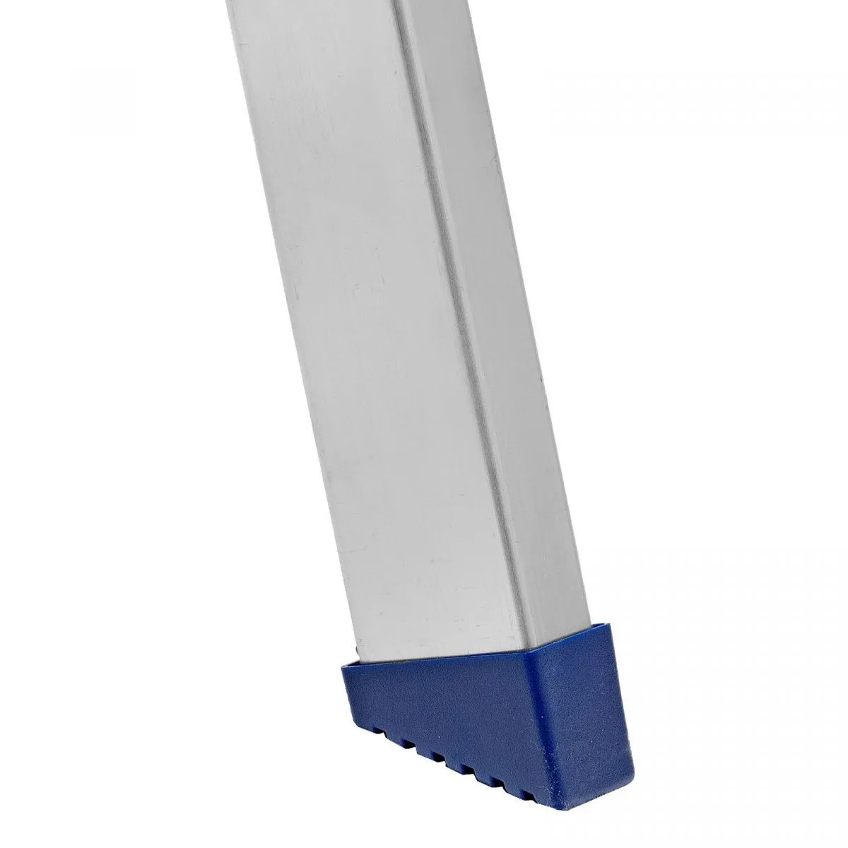 • Надежность — рама из прямоугольного алюминиевого профиля выдерживает нагрузку до 150 кг, широкие ступени закреплены заклепками.