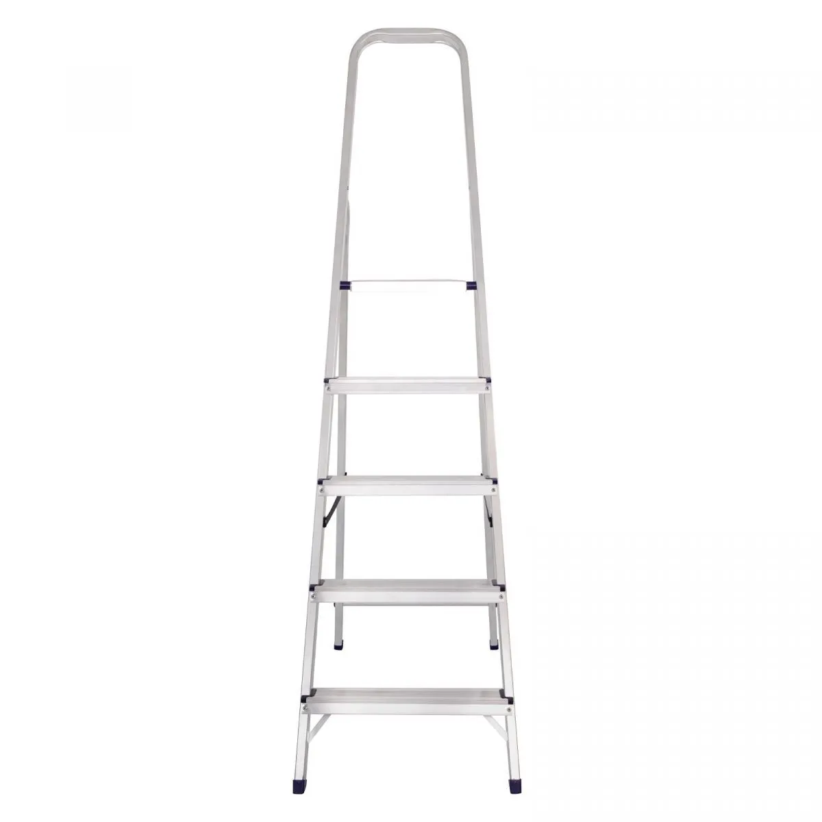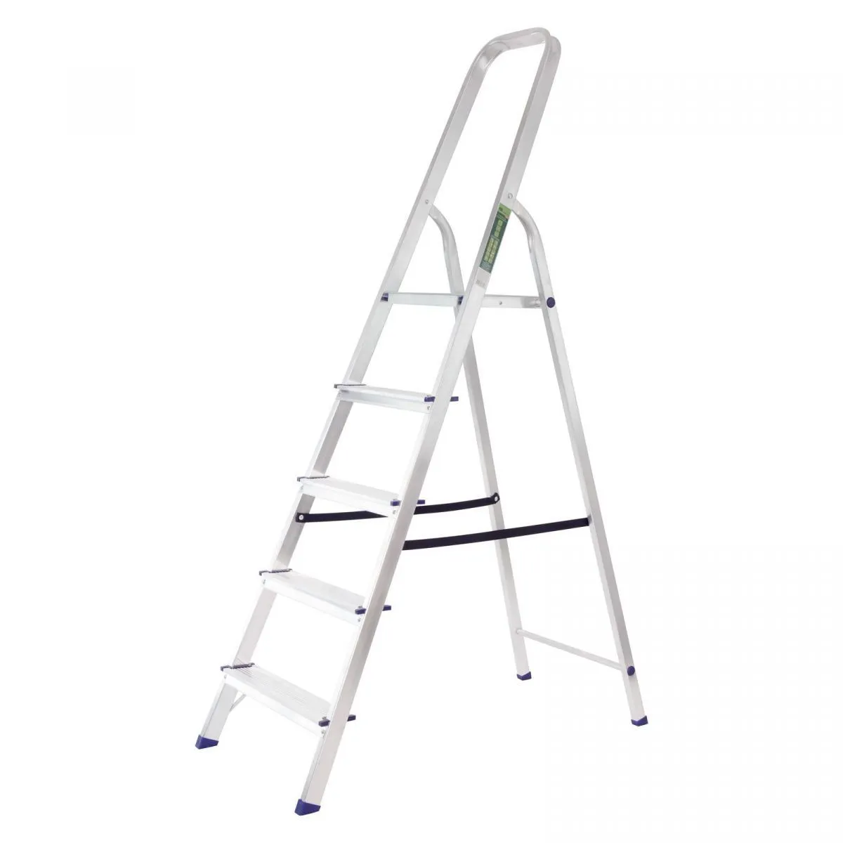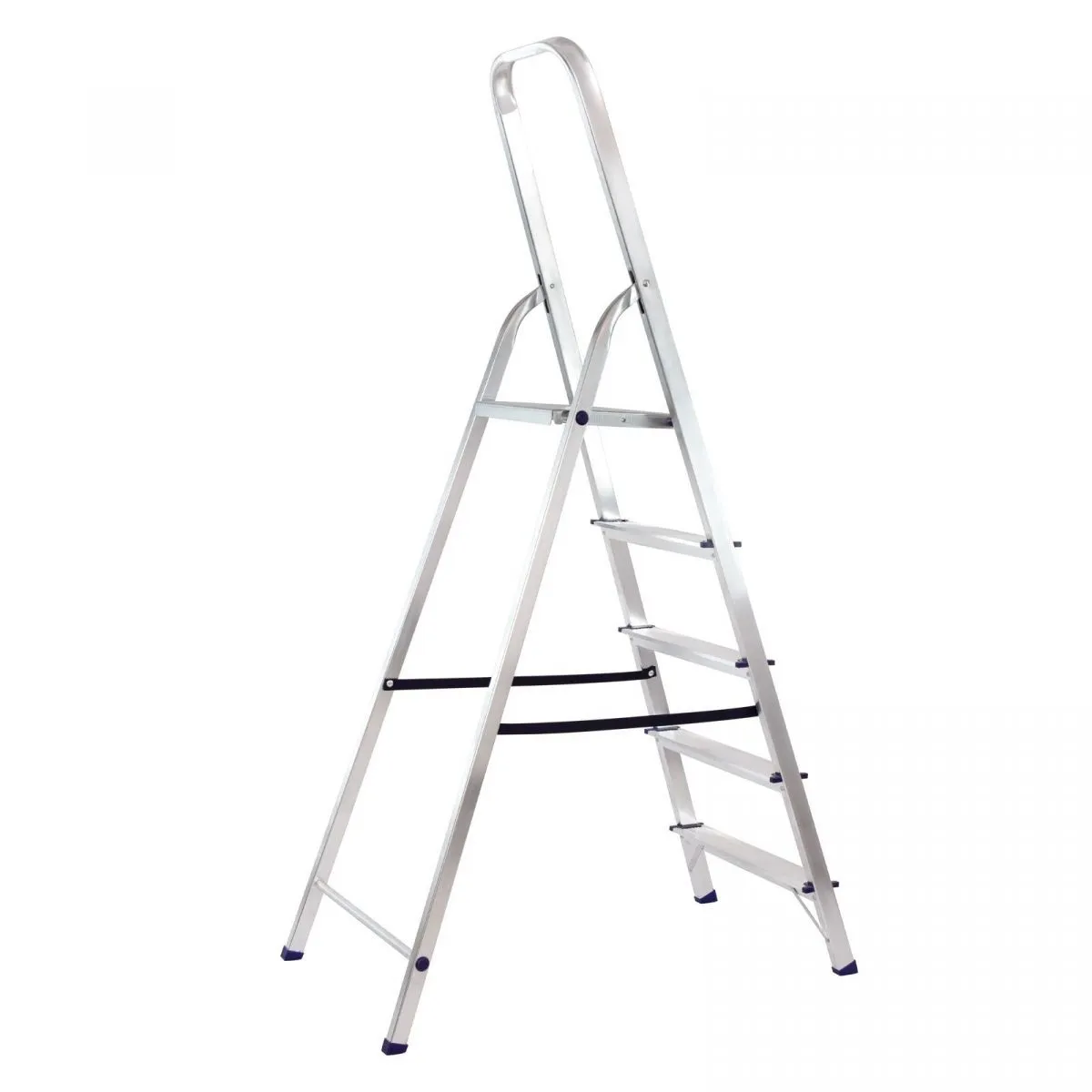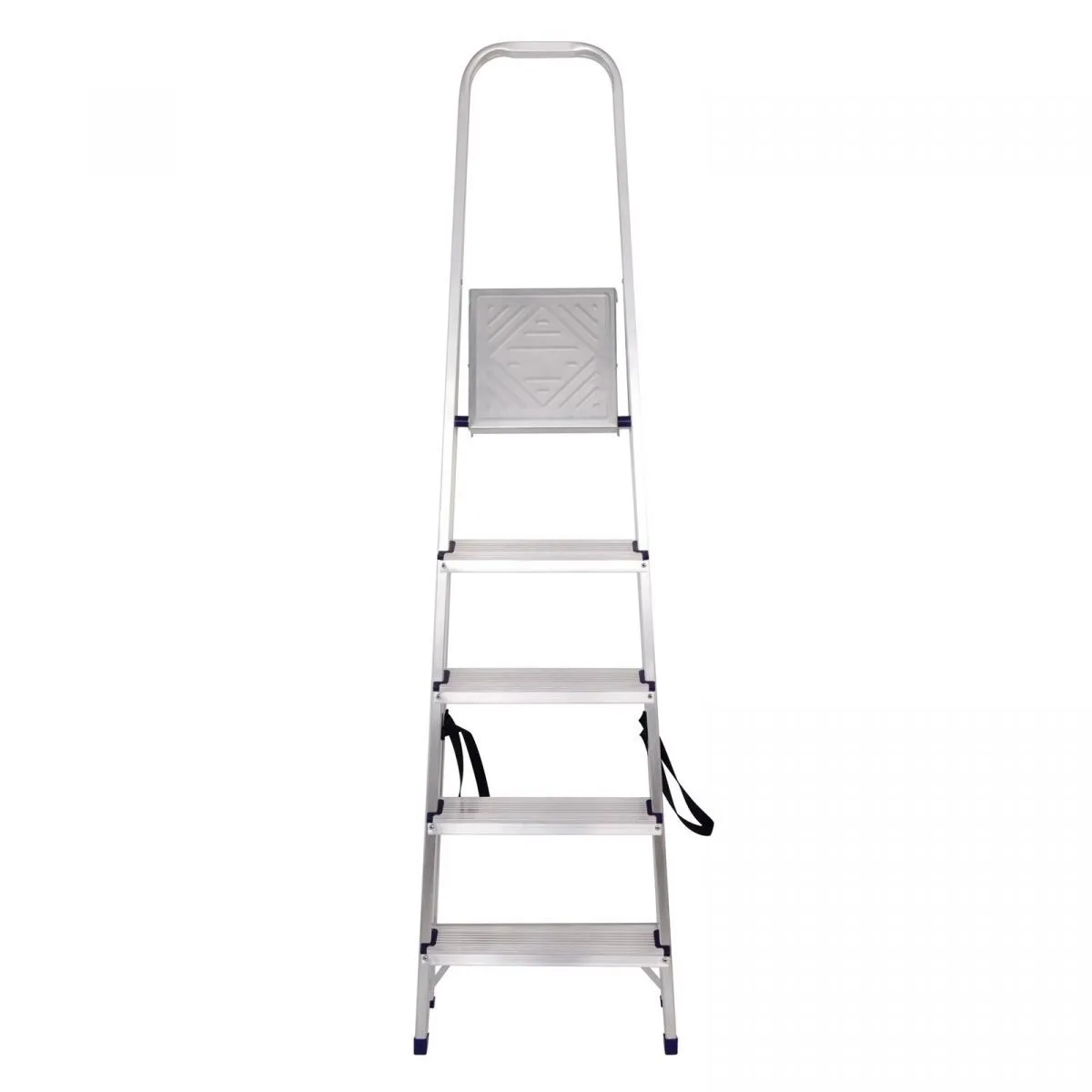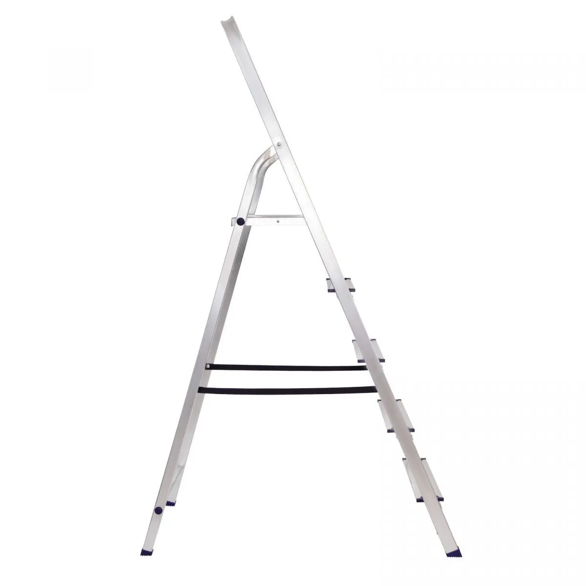 • Надежность — рама из прямоугольного алюминиевого профиля выдерживает нагрузку до 150 кг, широкие ступени закреплены заклепками, страховочные стяжки повышают прочность конструкции.