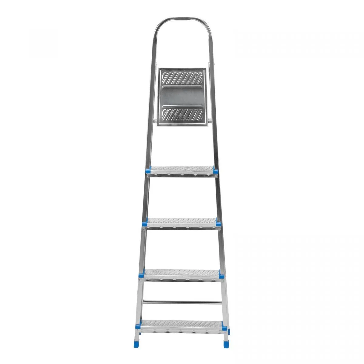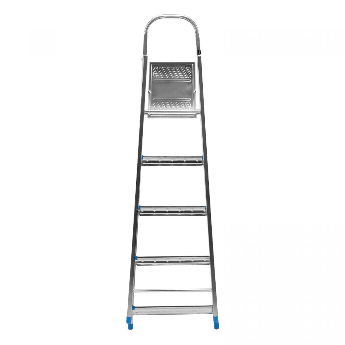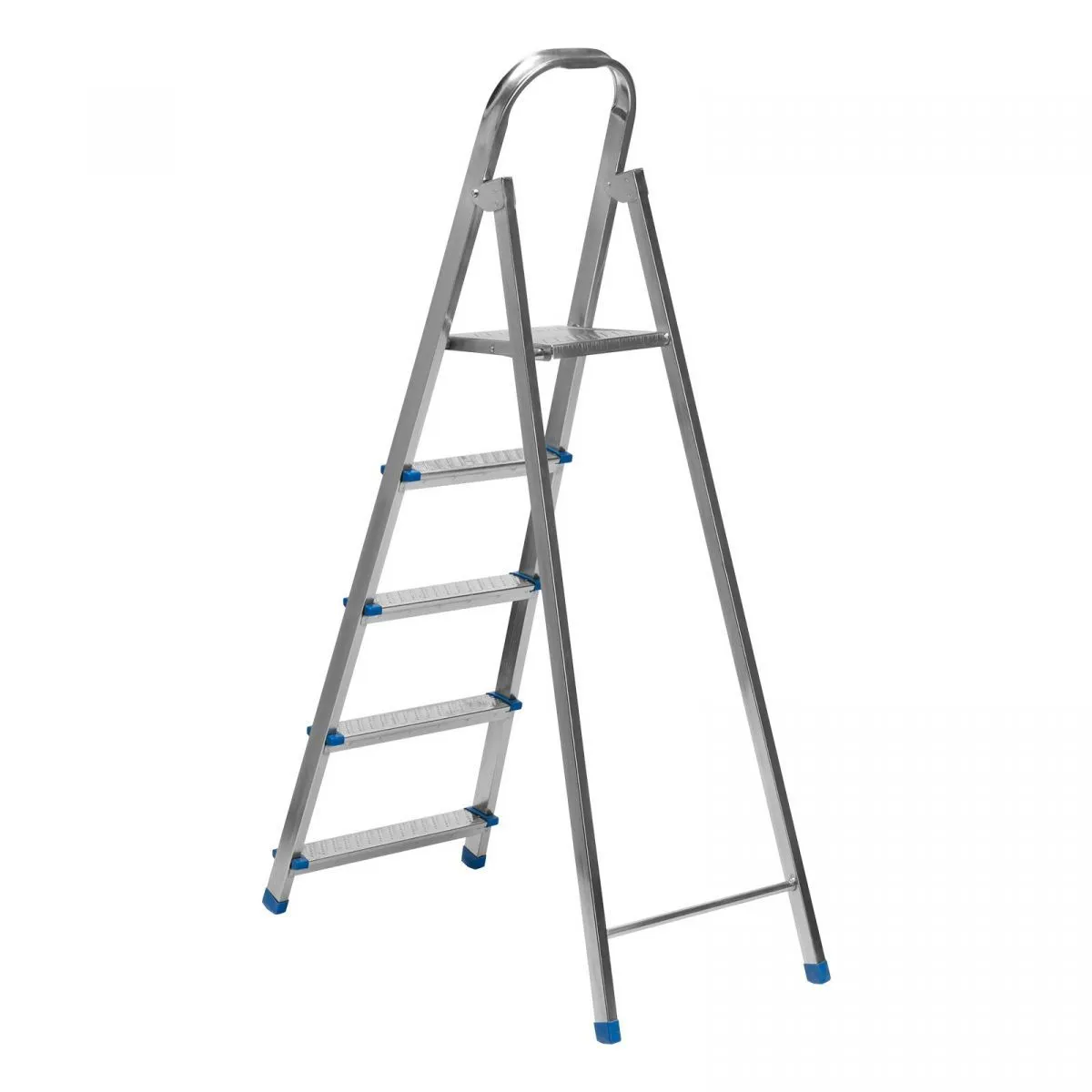 Стальная оцинкованная стремянка Сибртех 97837 с 5 ступенями позволяет повесить полку, картину или шкафчик, достать нужный предмет и решить другие задачи, для которых требуется доступ к предметам на высоте. Рама и ступени из стального профиля выдерживают вес до 120 кг. Расстояние от опорной поверхности до площадки составляет 99 см, при среднем росте пользователя 170 см рабочая высота лестницы — 299 см. Необходимо соблюдать технику безопасности: размещать стремянку только на ровной плоскости и не использовать ее для работы с дрелью, шуруповертом и другим электроинструментом.