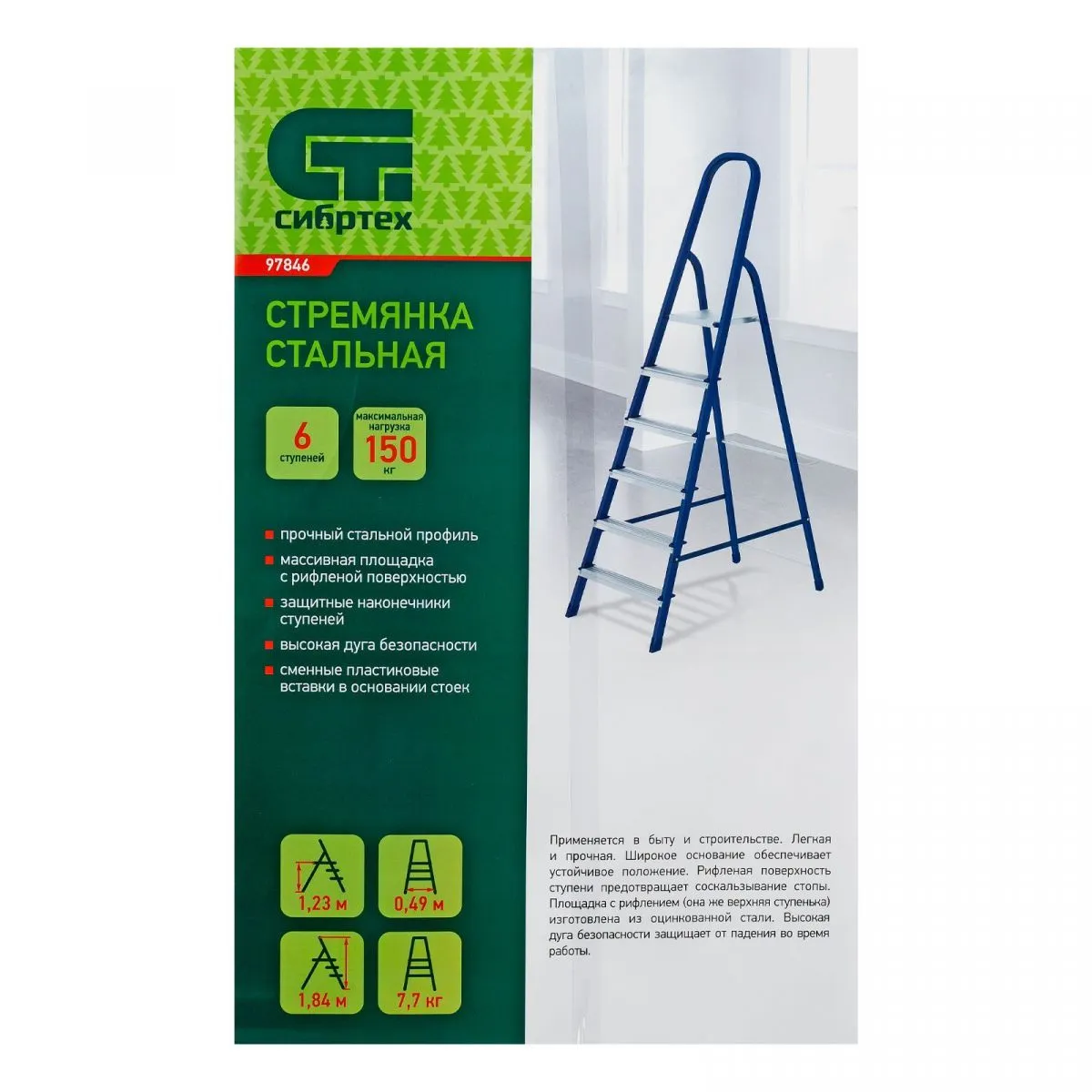 Стремянка стальная Сибртех 97846 с 6 ступенями облегчает выполнение ремонтных, отделочных, а также различных бытовых работ на высоте, превышающей человеческий рост. Площадка находится на высоте 122 см от опорной поверхности, рабочая высота стремянки составляет 322 см (при среднем росте пользователя 170 см). Высокая дуга безопасности обеспечивает удобную эксплуатацию. Стремянка пригодится дома и на даче.