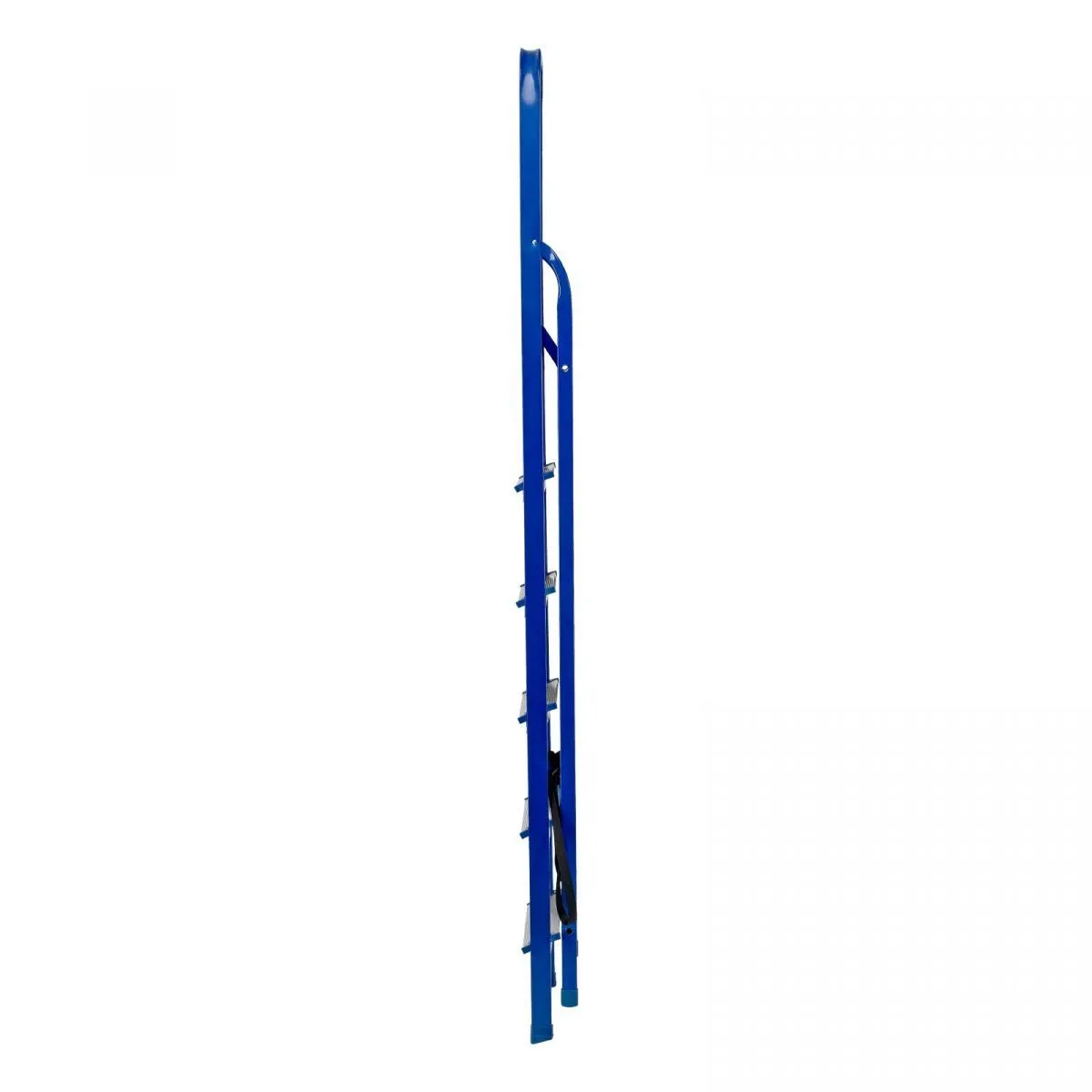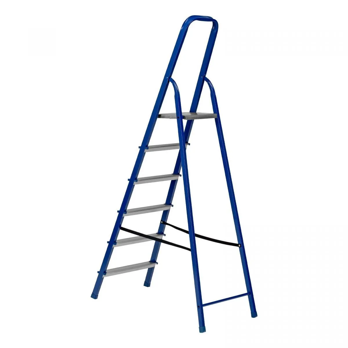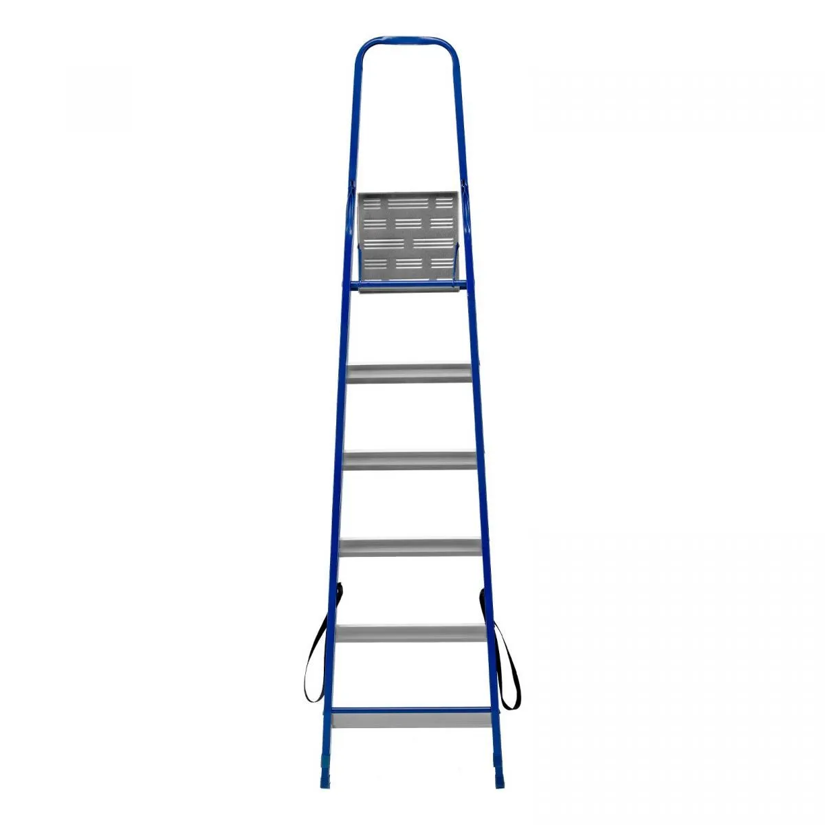 • Надежность — рама изготовлена из профилированной стали, стальная верхняя площадка с зацепами прочно фиксирует стремянку в рабочем положении, страховочные ленты придают дополнительную прочность конструкции.