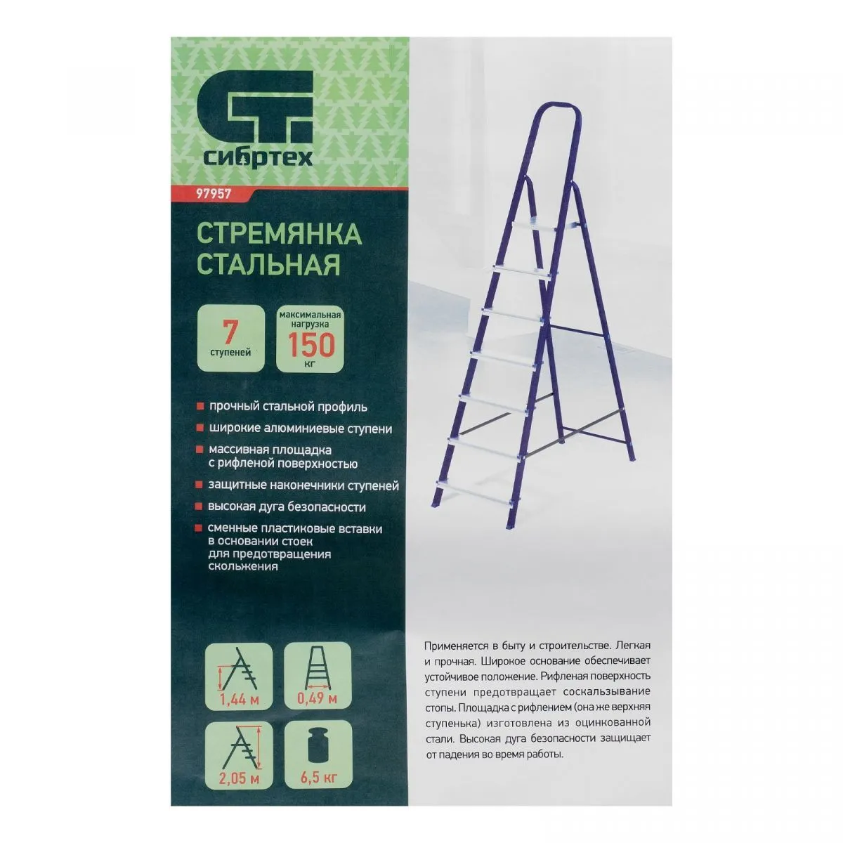 Стремянка Сибртех 97957 со стальным профилем и 7 ступенями, 6 из которых алюминиевые, упрощает доступ к предметам, расположенным на антресолях, шкафах, высоких полках. Также будет полезна для проведения отделочных и монтажных работ. Лестница обладает высокой прочностью при весе 7,6 кг и выдерживает нагрузку до 150 кг. Площадка находится на высоте 144,8 см от опорной поверхности, рабочая высота стремянки составляет 344,8 см (при среднем росте пользователя 170 см).