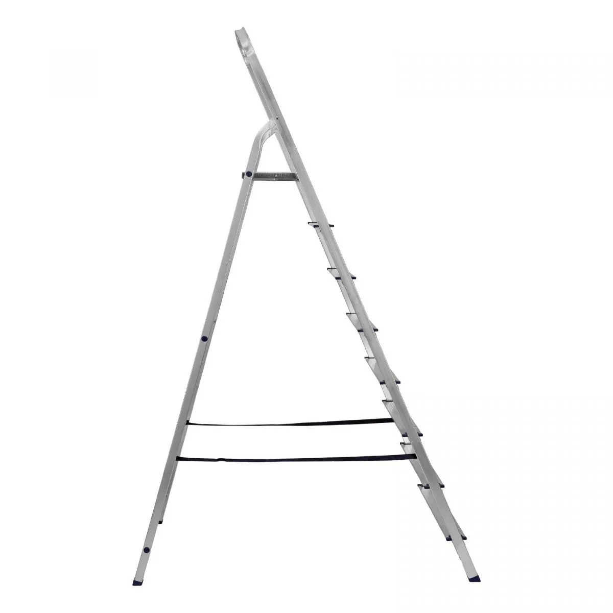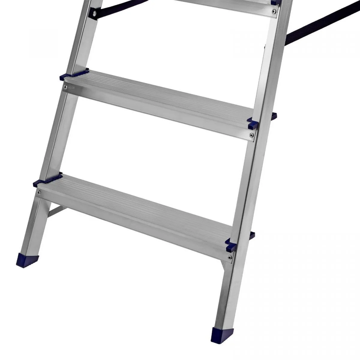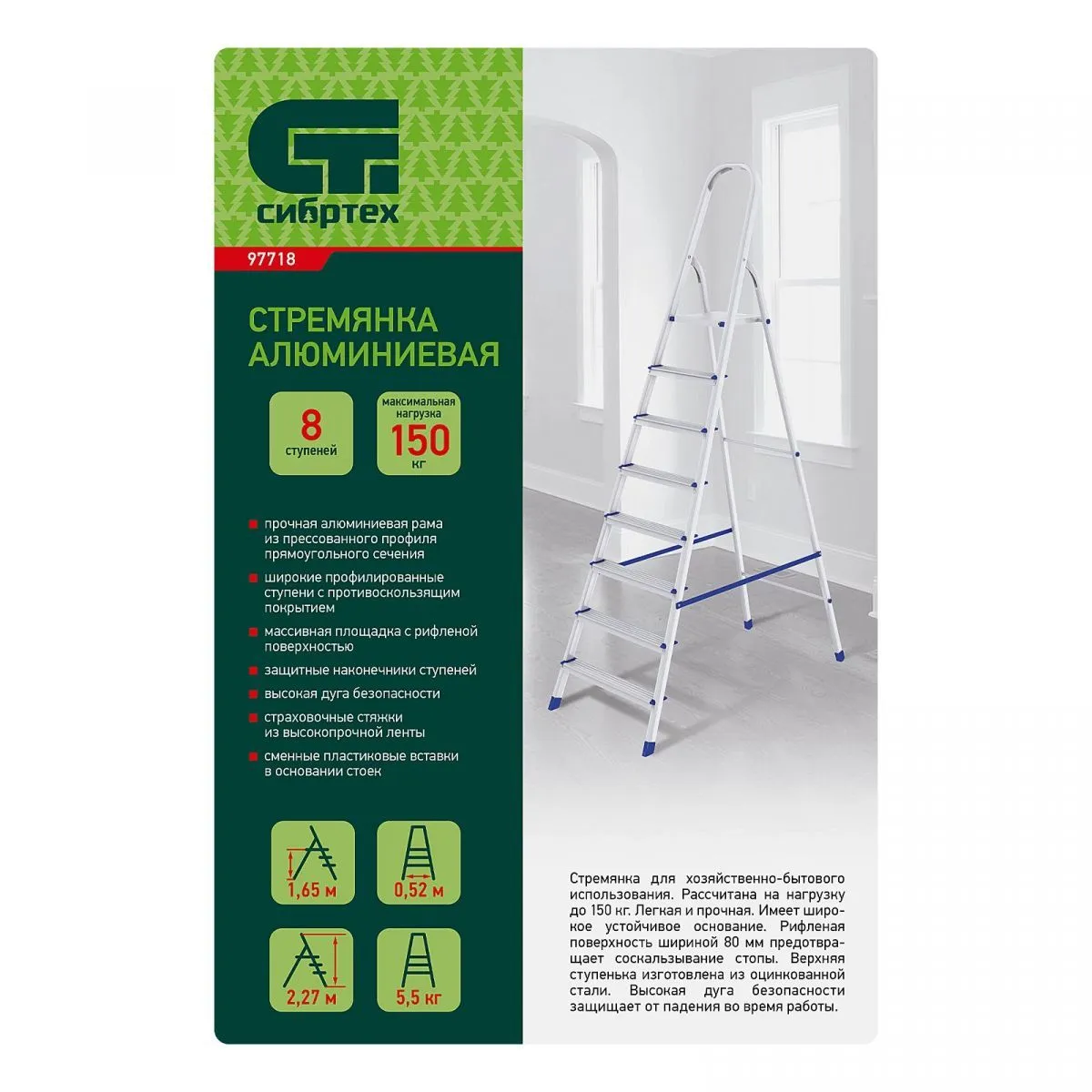 • Надежность — рама из прямоугольного алюминиевого профиля выдерживает нагрузку до 150 кг, широкие ступени закреплены заклепками, страховочные стяжки повышают прочность конструкции.