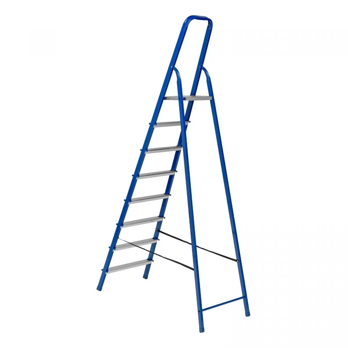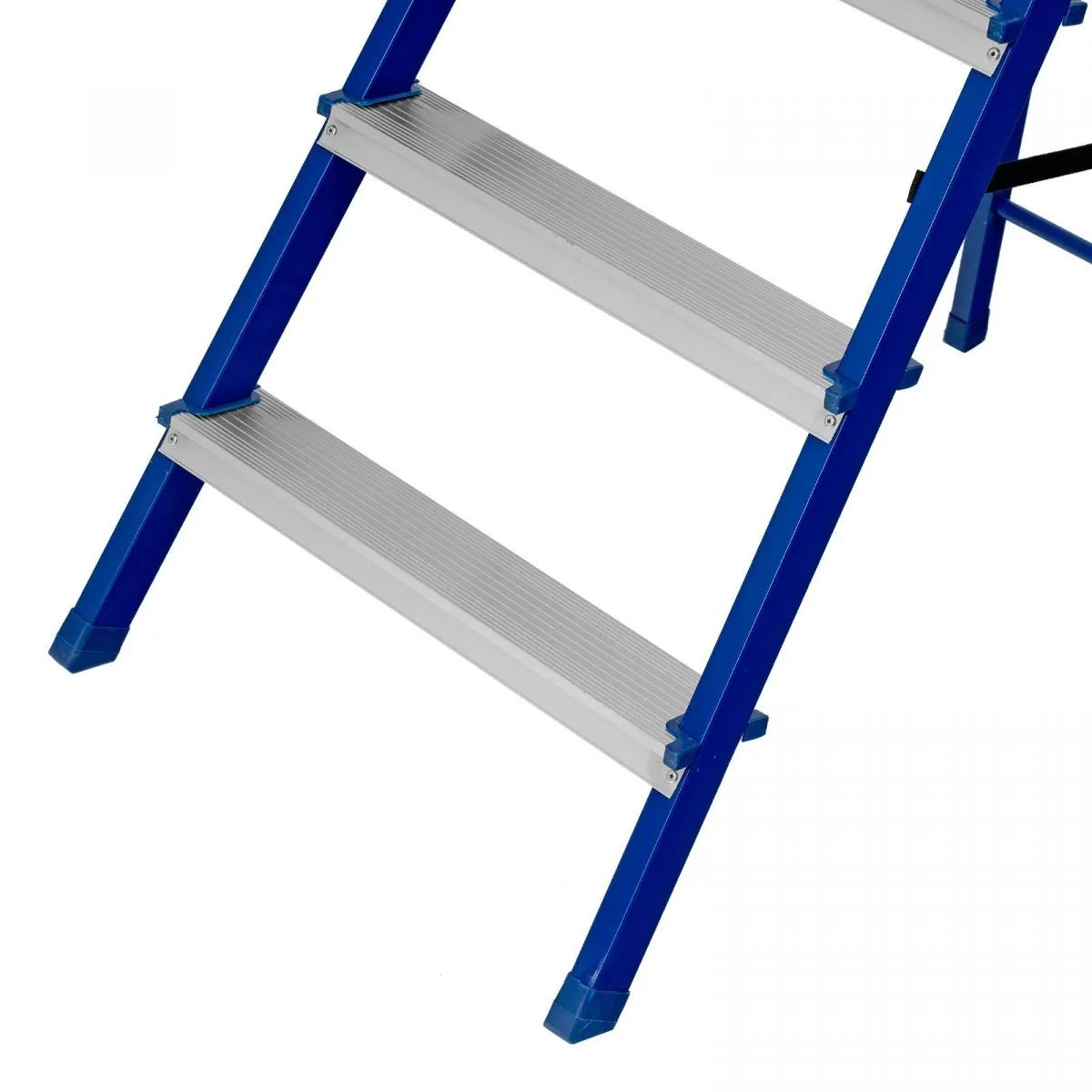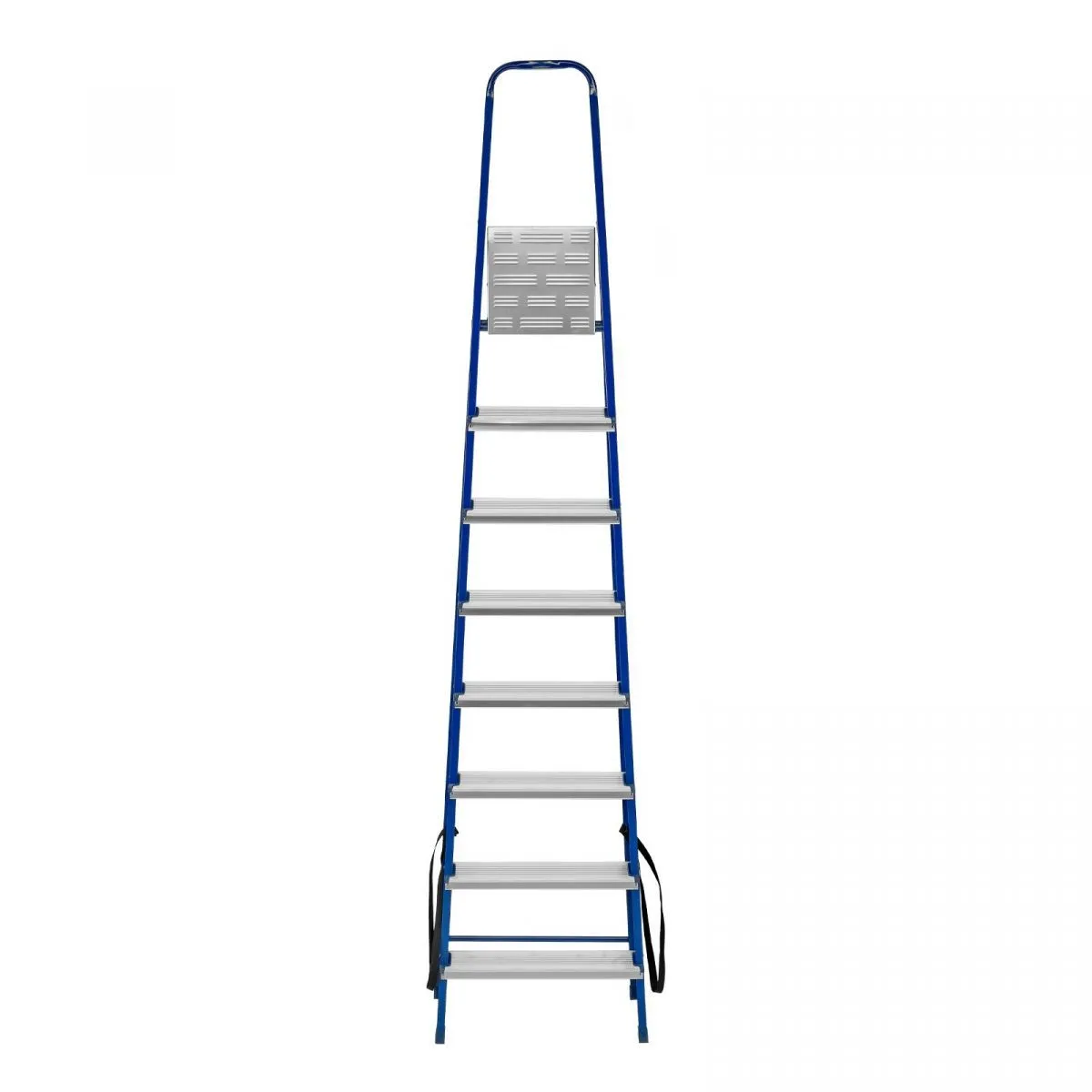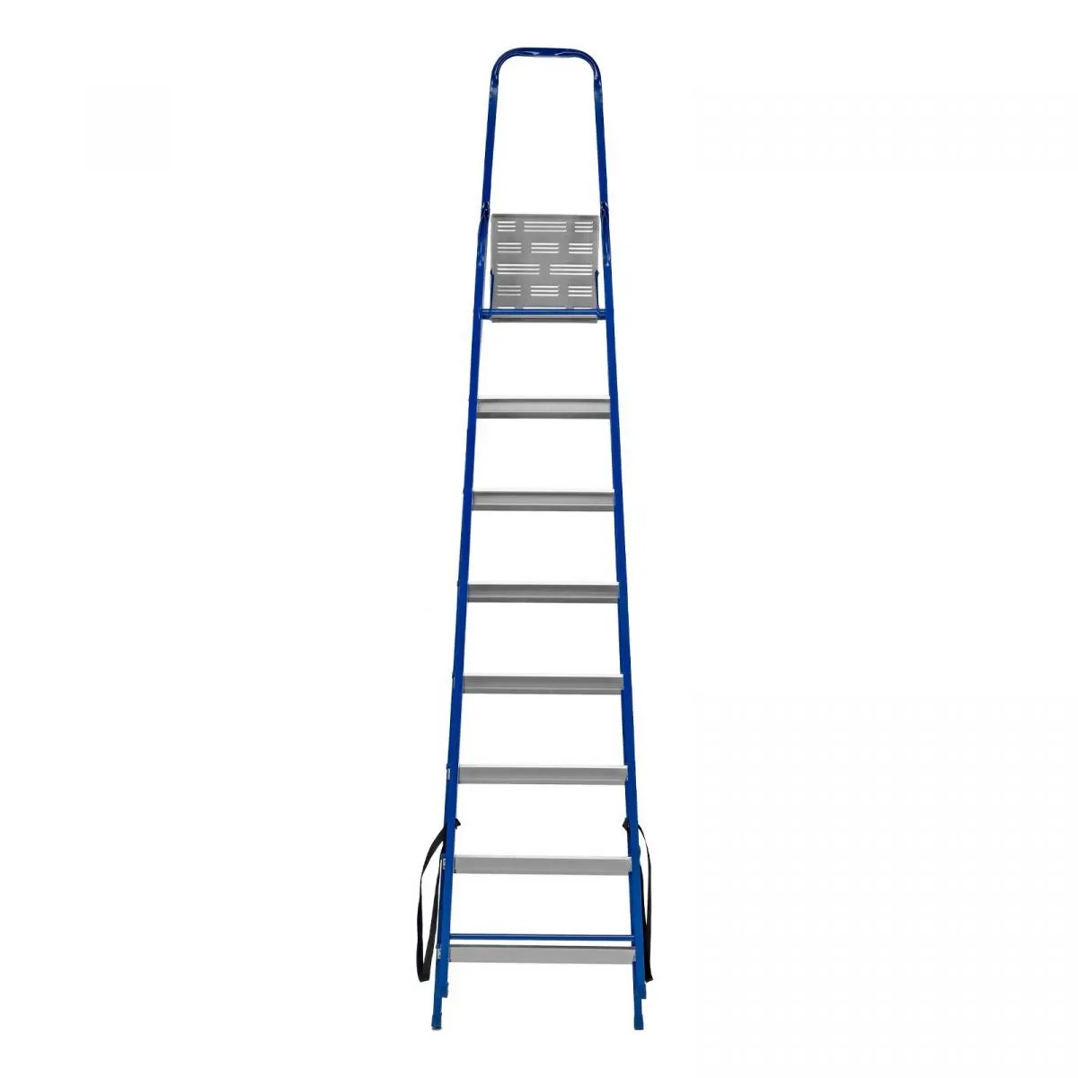 • Надежность — рама изготовлена из профилированной стали, стальная верхняя площадка с зацепами прочно фиксирует стремянку в рабочем положении, страховочные ленты придают дополнительную прочность конструкции.