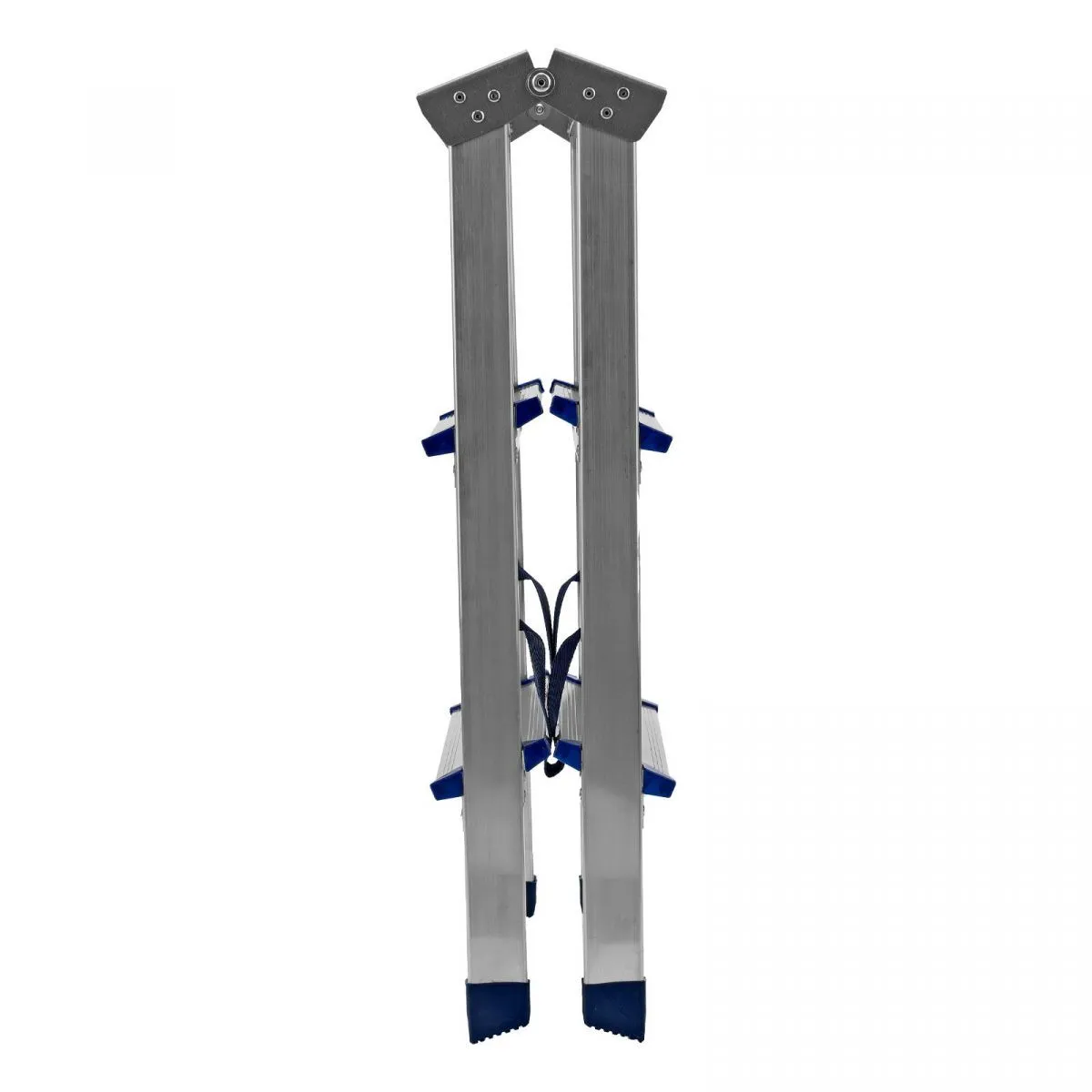 Стремянка двусторонняя алюминиевая Сибртех 97923 с 3 ступенями позволяет выполнять различные действия на высоте — штукатурить или красить стены, менять лампочки, вытирать пыль, доставать нужные предметы с верхних полок. Площадка находится на высоте 60,4 см от опорной поверхности, рабочая высота стремянки составляет 260,4 см (при среднем росте пользователя 170 см).