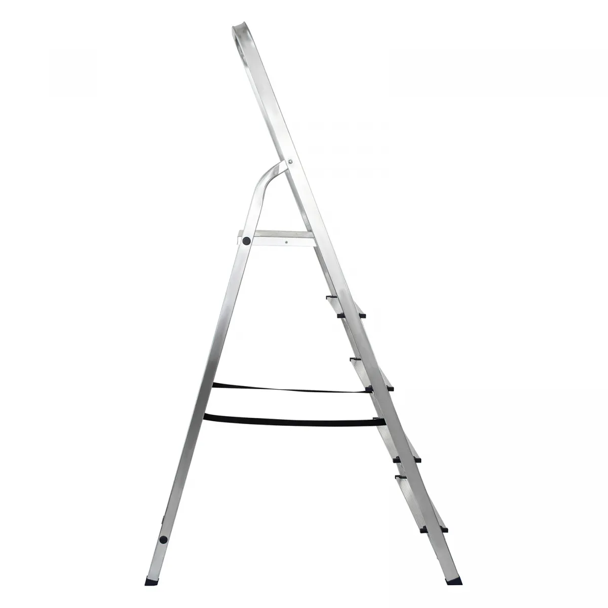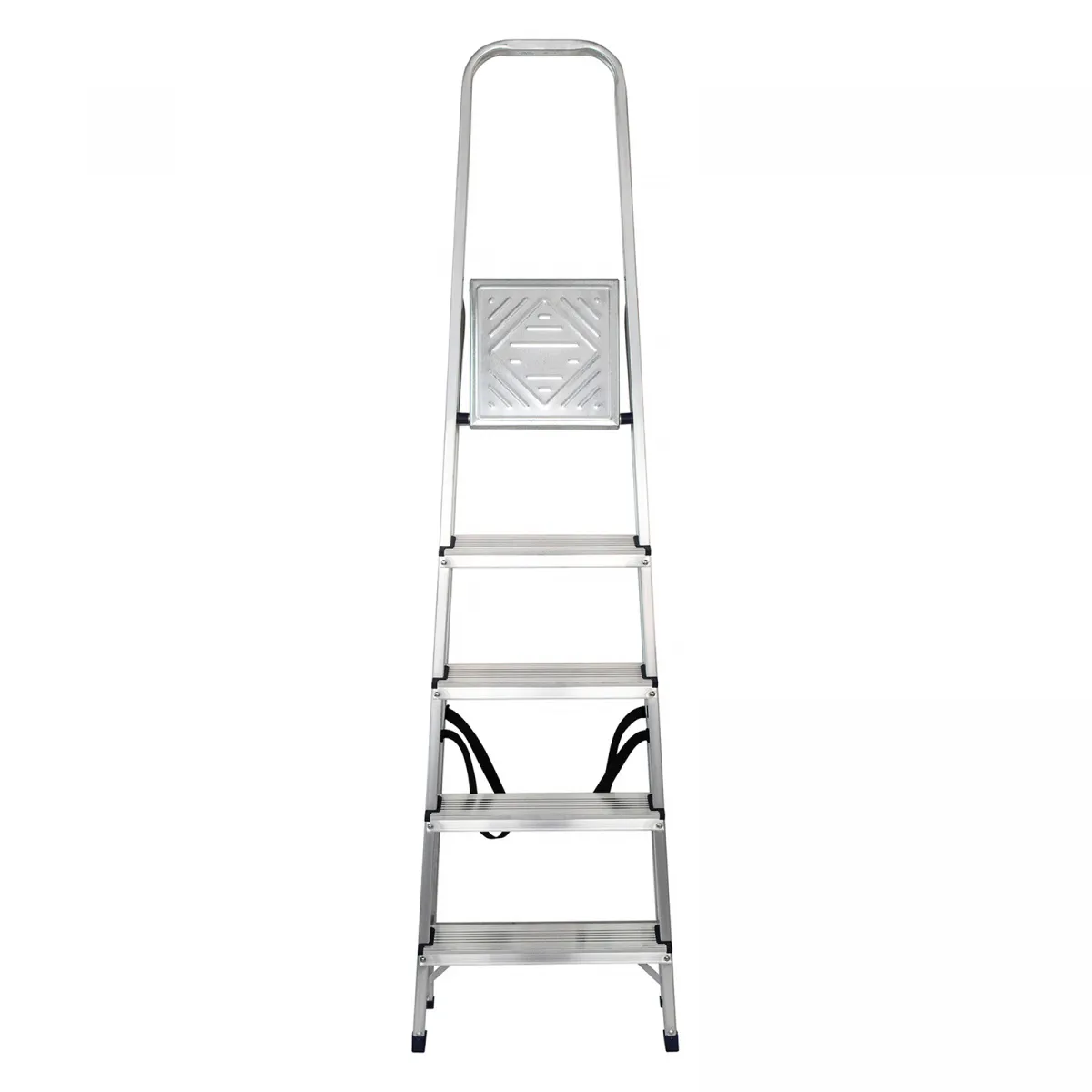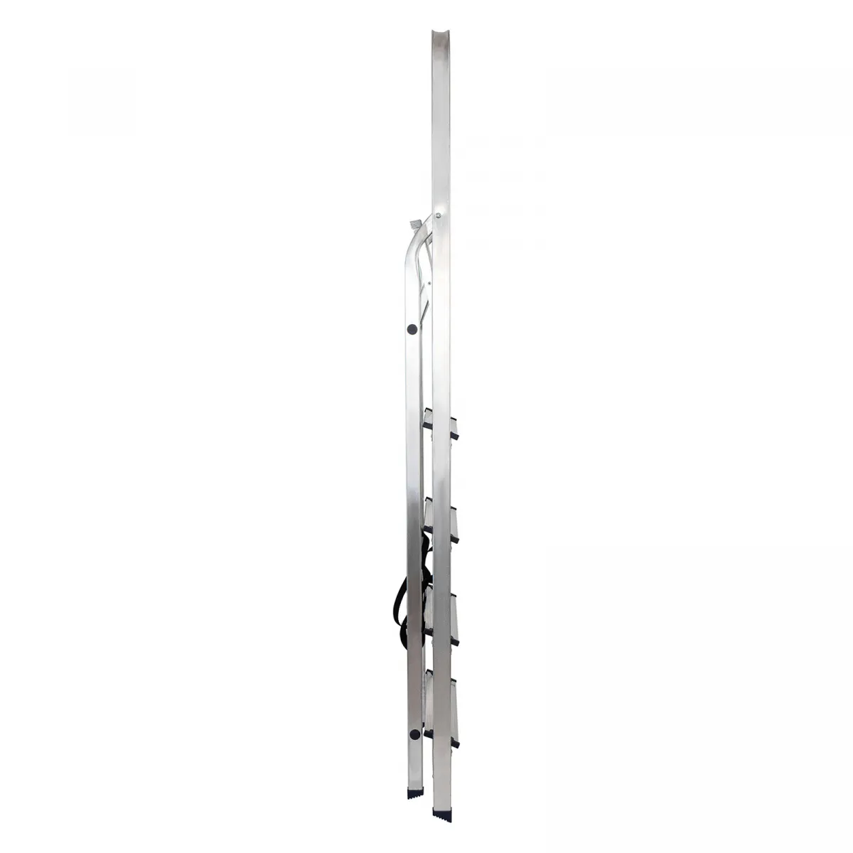 • Надежность — рама из прямоугольного алюминиевого профиля выдерживает нагрузку до 150 кг, широкие ступени закреплены заклепками, страховочные стяжки повышают прочность конструкции.