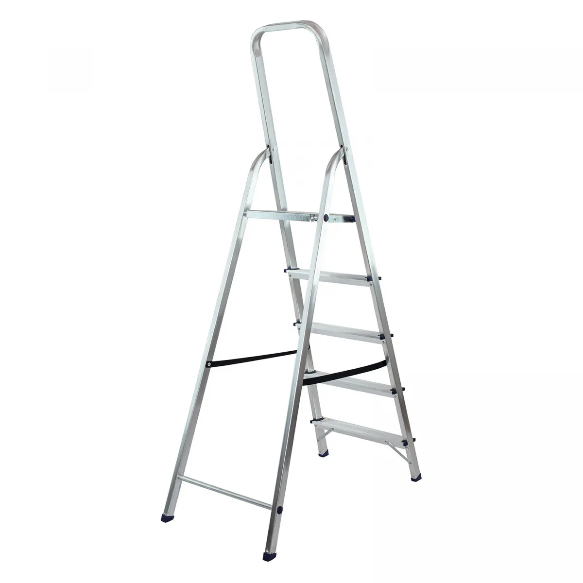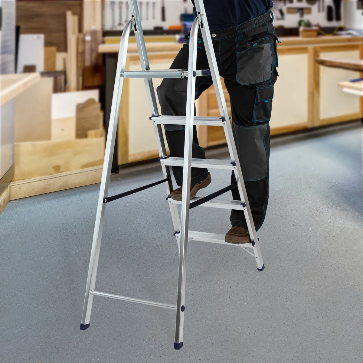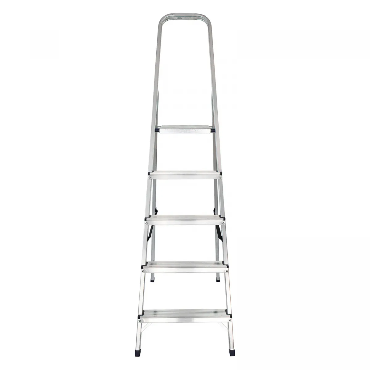 • Надежность — рама из прямоугольного алюминиевого профиля выдерживает нагрузку до 150 кг, широкие ступени закреплены заклепками, страховочные стяжки повышают прочность конструкции.