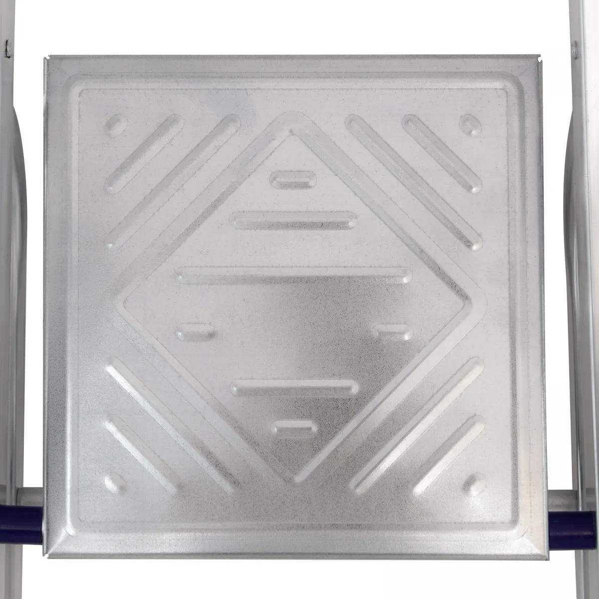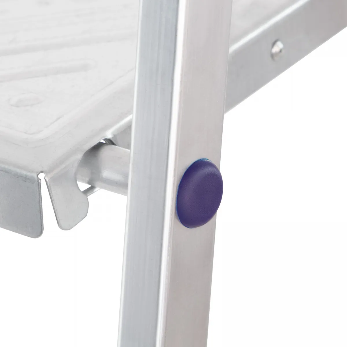 • Продуманная конструкция — стальная рабочая площадка с зацепами надежно фиксирует стремянку в разложенном положении.