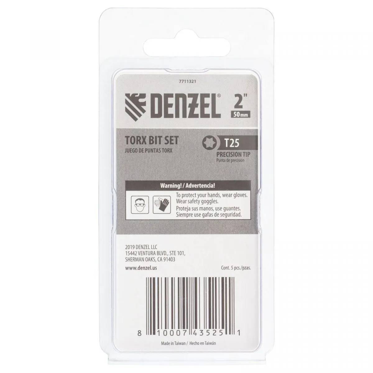 Набор бит Denzel 7711321 типоразмера T25 x 50, 5 шт. в упаковке, подходит для использования с шуруповертами, электрическими отвертками и отвертками-держателями. Используется для сборки и ремонта бытовой техники и электроприборов. Будет полезен в мастерской, пригодится также дома, в гараже и на даче.
