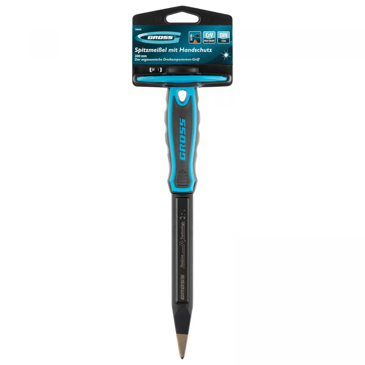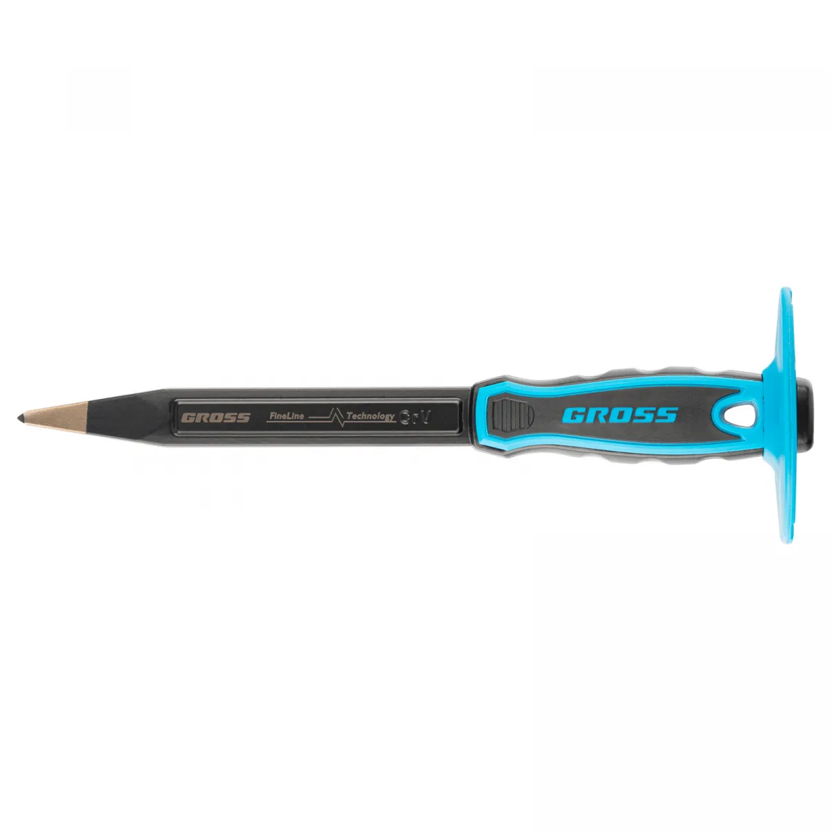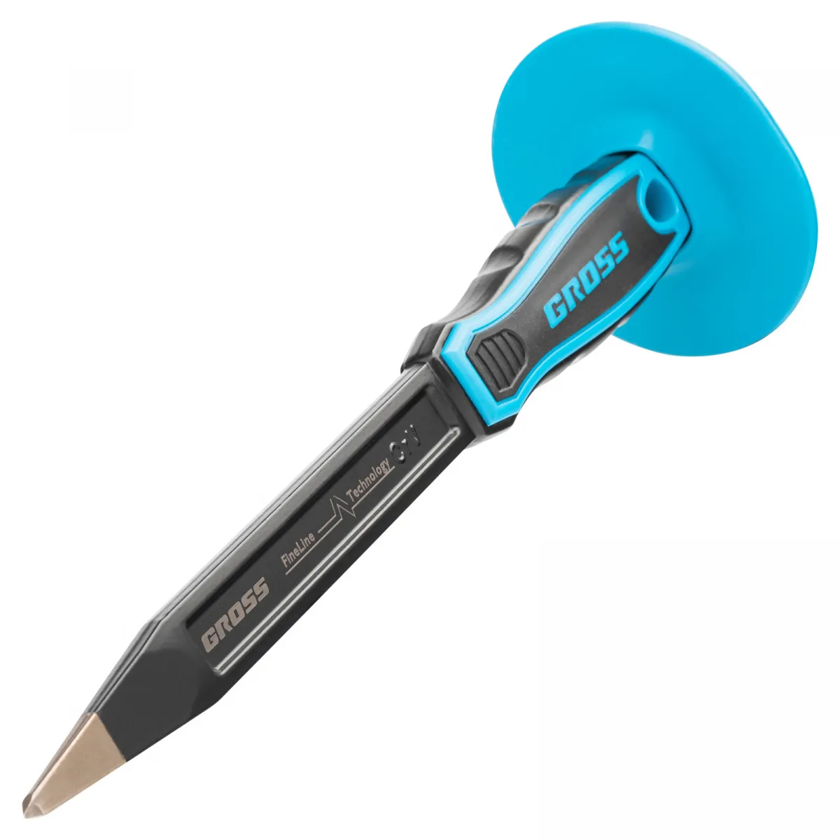 Зубило-керн Gross 18805 длиной 300 мм — ручной инструмент для использования совместно с молотком или кувалдой. Рабочая часть с двусторонней заточкой позволяет штробить бетон или создавать лунки для разметки и установки сверла и бура.